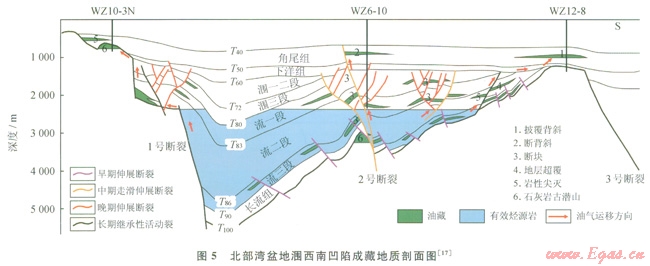 北部灣盆地處于南海北部大陸架西段,盆地經(jīng)歷古近紀(jì)斷陷、新近紀(jì)與第四紀(jì)坳陷、新構(gòu)造活動階段,二級構(gòu)造單元呈三坳兩隆,即北部坳陷、企西隆起、中部坳陷、南部隆起和南部坳陷,三級構(gòu)造單元包括l0多個(gè)凹陷和凸起[2,14](45)。上述凹陷被次凸等進(jìn)一步分隔成多個(gè)洼陷,多數(shù)洼陷呈“肉(古近系)厚皮(新近系)的地層特征,洼陷是油氣生成的基本單元。烴源巖為始新統(tǒng)流沙港組中深湖相泥巖,其有機(jī)質(zhì)類型以腐泥型和偏腐泥混合型為主,有機(jī)質(zhì)豐度高[3],屬于好烴源巖,比較單一,但在各洼陷分布差異甚大。北部灣盆地地溫梯度較高,為32.9±7.1℃km,大地?zé)崃髦禐?span lang="EN-US">65.7±8.9mWm2,屬于熱盆。流二段烴源巖R。介于0.2%~l.2%,熱演化程度為低熟成熟階段,以生油為主[2-3]。因此受源熱共控,北部灣盆地部分凹陷成為富油凹陷,已證實(shí)的富油凹陷有潿西南凹陷(3個(gè)洼陷組成)、福山凹陷和烏石凹陷東洼。縱向上石油分布于石炭系古潛山組合、古新統(tǒng)長流組—始新統(tǒng)流沙港組下組合、漸新統(tǒng)潿洲組中組合、新近系下洋組—角尾組上組合。北部灣盆地自新近紀(jì)以來,絕大多數(shù)區(qū)域新構(gòu)造運(yùn)動微弱[2,14],石油近距離或源內(nèi)聚集,目前北部灣盆地發(fā)現(xiàn)的石油主要集中在中、下組合。