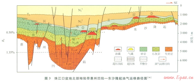 珠江口盆地北部坳陷帶(2、3)處于南海北部大陸邊緣陸架上,盆地基底是燕山期島弧帶,盆地形成經(jīng)歷古近紀(jì)斷陷、新近紀(jì)坳陷與新構(gòu)造期3個(gè)階段。其中始新統(tǒng)文昌組沉積末期盆地受到強(qiáng)烈改造,地層遭受較大規(guī)模剝蝕。盆地二級構(gòu)造單元有珠一坳陷和珠三坳陷等。三級構(gòu)造單元包括10多個(gè)凹陷和凸起。凹陷是潛在的生烴單元,但都比較破碎,多數(shù)凹陷被次級凸起進(jìn)一步分隔成多個(gè)洼陷。洼陷才是最基本的生烴單元,多數(shù)洼陷呈“肉(古近系)厚皮(新近系)特征。烴源巖為始新統(tǒng)文昌組中深湖相泥巖、漸新統(tǒng)恩平組湖沼相煤系地層[3],部分凹陷可能殘留有中生代海相—海陸過渡相烴源巖。該區(qū)域地溫梯度及大地?zé)崃髦捣謩e為36.6±6.0℃km66.1±8mWm2[15],屬于熱盆。始新統(tǒng)文昌組中深湖相泥巖烴源巖有機(jī)碳含量介于0.50%~4.88%,平均為1.22%,以偏腐泥混合型干酪根為主,埋藏深度處在生油窗范圍,主要生油,是主力生油巖;恩平組因埋藏淺、熱演化程度低在珠一坳陷生成少量石油,在珠三坳陷生成部分天然氣。因此主力烴源巖為始新統(tǒng)文昌組,比較單一,決定了以油為主的縱向分布特征[3]。已發(fā)現(xiàn)的生油洼陷有惠州26洼、陸豐l3洼、番禺4洼、恩平l7洼、珠三坳陷文昌B洼等??v向上石油分布在基底組合、始新統(tǒng)文昌組—恩平組下組合、漸新統(tǒng)珠海組—下中新統(tǒng)珠江組中組合、中上新統(tǒng)粵海組—萬山組上組合。珠江口盆地北部新構(gòu)造活動劇烈,石油晚期運(yùn)移活躍,目前發(fā)現(xiàn)的石油主要集中在中組合,其他組合是下一步的油氣勘探方向。