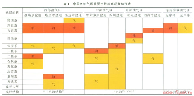 中國不同盆地群的盆地在縱向上有不同的油氣(包括常規(guī)油氣和非常規(guī)油氣)成烴樣式(1)。如鄂爾多斯盆地油氣田呈“下氣(古生界)上油(三疊系—侏羅系)”格局、松遼盆地油氣田呈下氣(下白堊統(tǒng))上油(上白堊統(tǒng))”格局,其他盆地也呈現(xiàn)出油氣田在空間上有序分布的特征(1)。但以油氣區(qū)(盆地群)為單元,進(jìn)而討論中國海陸總體油氣田分布規(guī)律的研究并不多見,而進(jìn)一步歸納全國油氣田空間分布模式、揭示其成因,準(zhǔn)確把握油氣田分布規(guī)律,對于指導(dǎo)油氣領(lǐng)域勘探有著極其重要的意義。