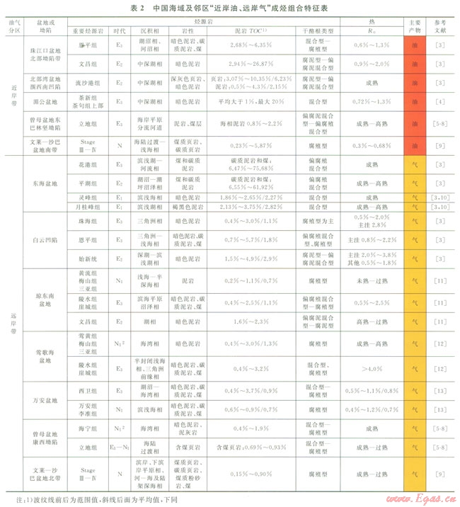 中國東南沿海油氣區(qū)指東海海域和南海海域油氣區(qū)。油氣區(qū)內(nèi)盆地的基底是印支、燕山期造山帶,盆地屬于邊緣海盆地,結(jié)構(gòu)呈斷陷—坳陷,充填的主要地層為新生界(局部有中生代殘留盆地)。盆地的烴源巖時(shí)代相對單一,主要發(fā)育一套古近紀(jì)—新近紀(jì)地層[2-13],在不同盆地生油氣性質(zhì)不同,從油氣田分布看,可以分成近岸原油帶和遠(yuǎn)岸天然氣帶(1、表2)。