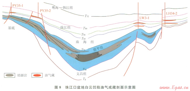 珠江口盆地位于南海北部大陸邊緣東段,白云凹陷位于珠江口盆地南部坳陷帶珠二坳陷內(nèi),凹陷基底是燕山期島弧帶,凹陷內(nèi)新生代地層發(fā)育。白云凹陷演化歷經(jīng)了古近紀(jì)裂陷期,早、中中新世坳陷期和晚中新世以來的新構(gòu)造期[20]。白云凹陷發(fā)育始新統(tǒng)文昌組中深湖相泥巖、下漸新統(tǒng)恩平組海陸過渡相煤系地層與海灣相泥巖、上漸新統(tǒng)珠海組海相泥巖共計(jì)3套烴源巖(8)。恩平組海陸過渡相煤系地層海灣相泥巖是主力烴源巖,其中暗色泥巖總有機(jī)碳含量介于1.0%~l.5%,展布規(guī)模大,烴源巖母質(zhì)類型多為偏腐殖混合型及腐殖型。恩平組煤系烴源巖主要發(fā)育在凹陷北部斜坡區(qū)域,展布范圍超過5000km2,煤層發(fā)育,在PY33-1-1井恩平組有煤20層,累計(jì)厚度為22.98m[18]。文昌組中深湖相烴源巖有機(jī)碳含量介于0.50%~4.88%,平均為1.22%,以偏腐泥混合型十酪根為主。白云凹陷位于洋陸過渡區(qū),地溫梯度及大地?zé)崃髦捣謩e高達(dá)4.5℃100m77.5mWm2[15],屬于超熱盆。白云凹陷恩平組底部烴源巖現(xiàn)今成熟度在凹陷中心部位R。為0.5%~2.0%,主凹最深處尺。達(dá)到2.0%,在凹陷邊緣部位R。介于0.5%~0.7%;有機(jī)質(zhì)熱演化多處在成熟~高熟凝析油及生氣階段,其烴類產(chǎn)物以大量天然氣及少量輕質(zhì)油及凝析油為主;主洼以生氣為主,周邊的衛(wèi)星洼陷埋藏淺,以生油為主。此外,文昌組烴源巖在白云凹陷斜坡帶現(xiàn)今R。為2.1%,表明文昌組烴源巖也已經(jīng)達(dá)到生氣階段。白云凹陷及其鄰區(qū)發(fā)育漸新統(tǒng)儲蓋組合和新近系儲蓋組合,油氣勘探都有重要發(fā)現(xiàn);目前的油氣勘探發(fā)現(xiàn)多在珠江組;預(yù)測主力儲蓋組合為恩平組與珠海組。