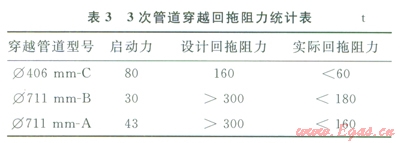 3)回拖階段,采用了新型地錨,保證了回拖施工的安全。采用漂管施工,降低了回拖阻力。外防腐層增加了新型玻璃鋼防腐技術(shù),有效地保護(hù)了防腐層。經(jīng)過一系列技術(shù)創(chuàng)新,大大降低了回拖阻力,使得回拖施工順利完成。