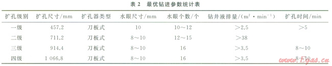 3)加大鉆井液排量,改進(jìn)水眼配置,提高水眼射速。擴(kuò)孔水力參數(shù)對(duì)比情況見表1。