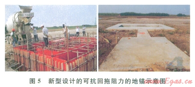 1)設(shè)計(jì)特殊地錨。通過計(jì)算回拖阻力,設(shè)計(jì)了專門針對(duì)大噸位回拖阻力的地錨(5),以抵抗大的回拖阻力。