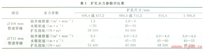 Æ406mm管道穿越擴(kuò)孔施工時(shí)發(fā)現(xiàn)鉆井液排量低于2m2min、水眼射速低于50ms時(shí)擴(kuò)孔扭矩大,鉆具磨損快。Æ711mm管道穿越擴(kuò)孔施工時(shí)調(diào)整了施工參數(shù),改進(jìn)了擴(kuò)孔器選型,使得擴(kuò)孔扭矩得到了有效控制,鉆屑及時(shí)排除,水力切削充分,鉆具幾乎沒有磨損,加快了施工進(jìn)度,保證了每次擴(kuò)孔一次性成功。根據(jù)3次管道穿越對(duì)鉆進(jìn)參數(shù)的調(diào)整情況,并結(jié)合現(xiàn)場(chǎng)實(shí)際可以達(dá)到的施工條件,最優(yōu)的鉆進(jìn)參數(shù)統(tǒng)計(jì)結(jié)果見表2