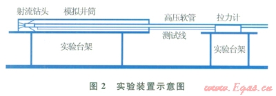 實(shí)驗(yàn)裝置示意圖如圖3所示。模擬井筒水平放置,固定于實(shí)驗(yàn)臺(tái)架上。實(shí)驗(yàn)臺(tái)架固定于地面上,保證實(shí)驗(yàn)時(shí)模擬井筒不發(fā)生移動(dòng)或轉(zhuǎn)動(dòng)。連接高壓軟管的多孔射流鉆頭放置于模擬井簡(jiǎn)內(nèi),將拉力測(cè)試線一端連接于多孔射流鉆頭后端接頭,另一端連接于拉力計(jì)上。拉力計(jì)固定于另一實(shí)驗(yàn)臺(tái)架上,2個(gè)實(shí)驗(yàn)臺(tái)架高度相同,以確保拉力測(cè)試線水平。實(shí)驗(yàn)時(shí),2個(gè)實(shí)驗(yàn)臺(tái)架均固定在地面上,通過(guò)拉力測(cè)試線長(zhǎng)度來(lái)確定射流鉆頭的正向噴距。經(jīng)實(shí)驗(yàn)測(cè)量,當(dāng)柴油機(jī)的轉(zhuǎn)數(shù)相同時(shí),無(wú)論連接哪種射流鉆頭,高壓泵的排量大小都相差不大。因此在實(shí)驗(yàn)中,通過(guò)固定柴油機(jī)轉(zhuǎn)數(shù)的方法來(lái)保證應(yīng)用不同射流鉆頭時(shí)流量相同。