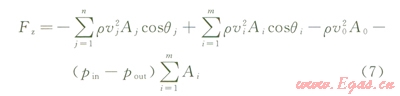 由于所選控制體關(guān)于x軸的對(duì)稱(chēng),其在y軸方向的動(dòng)量變化可以相互抵消,故只需分析控制體內(nèi)z軸方向的動(dòng)量變化和受力情況,故將式(1)投影于x軸可得: