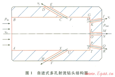 在徑向水平井正常鉆進(jìn)過(guò)程中,向后噴射的高速射流從反向孔眼噴出,射流會(huì)從它周?chē)砦黧w,由于射流鉆頭前面和四周均為巖石,外界流體補(bǔ)充困難,以至在射流鉆頭后部——環(huán)形區(qū)域形成低壓。由于反向射流是多股均勻分布的,所以在一定條件下可在射流鉆頭后端產(chǎn)生一個(gè)密閉環(huán)境的環(huán)形低壓區(qū)。此區(qū)域壓力低于井底環(huán)境壓力,由于壓差作用,會(huì)對(duì)射流鉆頭和高壓軟管產(chǎn)生一個(gè)向前的力,即為反向射流降壓效應(yīng)的自進(jìn)力產(chǎn)生機(jī)理。