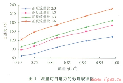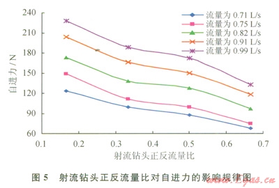 當(dāng)流量不變時(shí),射流鉆頭的正反流量比對(duì)自進(jìn)力的影響就顯得比較重要。通過(guò)實(shí)驗(yàn)測(cè)量發(fā)現(xiàn),射流鉆頭所產(chǎn)生的自進(jìn)力隨著正反流量比的增大而減小,近似呈線性關(guān)系變化(5)。以噴距為10mm,井筒直徑為49mm,流量為0.99Ls時(shí)為例,正反流量比為23的射流鉆頭所產(chǎn)生的自進(jìn)力為133.2N;正反流量比為l2的射流鉆頭所產(chǎn)生的自進(jìn)力為171.9N;正反流量比為l3的射流鉆頭所產(chǎn)生的牽引力為188.5N;正反流量比為l6的射流鉆頭產(chǎn)生所產(chǎn)生的牽引力為228.1N。這是因?yàn)殡S著正反流量比的減小,反向射流的流量分配比例增大,反向射流所產(chǎn)生的反推力也增大,同時(shí)反向射流的降壓效應(yīng)也越明顯,故可以產(chǎn)生更大的自進(jìn)力。在實(shí)驗(yàn)條件下,射流鉆頭流量比從16增大到13,排量在0.710.99Ls時(shí)范圍,所產(chǎn)生的自進(jìn)力范圍為67.8228.1N。