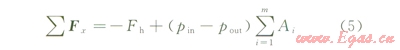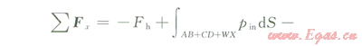 (2)右邊代表作用于控制體邊界上x軸方向上的外力矢量和,在x軸方向,射流鉆頭受到內(nèi)、外流體對(duì)控制體邊界的壓力,高壓軟管阻礙其前進(jìn)的力,即高壓軟管對(duì)射流鉆頭的拉力,此力大小和射流鉆頭產(chǎn)生的自進(jìn)力相等,方向相反,為作用力與反作用力的關(guān)系,則式(2)右邊可表示為: