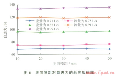 噴距是高壓水射流技術(shù)中的一個(gè)重要參數(shù),正向噴距是指射流鉆頭前端面與井底之間的距離。如圖6所示,在實(shí)驗(yàn)條件下,選取正反流量比為23的射流鉆頭作為研究對(duì)象,井筒直徑選取49mm,隨著正向噴距的增大,在同一流量下射流鉆頭產(chǎn)生的自進(jìn)力變化不大,基本持平。以流量為0.91Ls時(shí)為例,噴距為10mm時(shí),自進(jìn)力為ll8.7N;噴距為20mm時(shí),自進(jìn)力為ll9.6N;噴距為30mm時(shí),自進(jìn)力為ll7.8N;噴距為40mm時(shí),白進(jìn)力為ll8.9N;噴距為50mm時(shí),自進(jìn)力為ll9.1N。這主要是因?yàn)樯淞魉a(chǎn)生的反沖力大小僅與噴嘴出口處流速有關(guān),與接觸靶物時(shí)的速度無(wú)關(guān),故反沖力大小與正向噴距無(wú)關(guān),同時(shí)井筒直徑大小不變,改變正向噴距并不影響反向射流的降壓效應(yīng),所以正向噴距對(duì)自進(jìn)力的影響不大。在實(shí)驗(yàn)條件下,井筒直徑為49mm,排量范圍為0.710.99Ls,噴距從10mm增加到50mm時(shí),正反流量比為23的射流鉆頭所產(chǎn)生的白進(jìn)力范圍為67.8135.2N