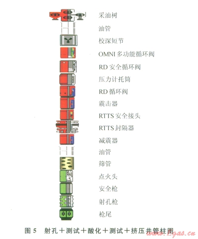 特點為:①管柱結(jié)構(gòu)簡單,安全適用,尤其是對于高溫高壓高產(chǎn)高含硫化氫的井況。②一趟管柱完成射孔、測試、酸化作業(yè),同時能進行擠壓井作業(yè),最大限度滿足安全需要。可采用投棒射孔或者管柱內(nèi)加壓延時射孔的方式。③利于酸化前后效果對比。④可以進行地面開關(guān)井,終關(guān)井采用井下關(guān)井,利于取得真實反映地層情況的壓力恢復(fù)曲線。