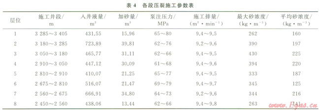 該井8段壓裂施工共注入地層液體總量3949.44m3,加入陶粒207.93m3,最高施工壓力80MPa,最高砂濃度394kgm3,最大施工排量9.8m3min。各段壓裂施工參數(shù)如表4所示。