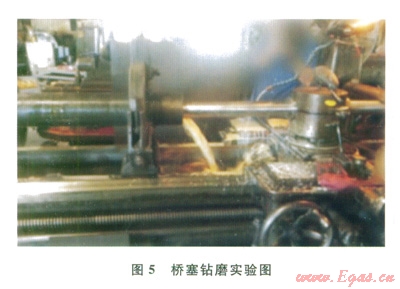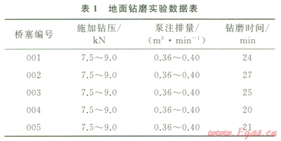 將坐封有新型速鉆復(fù)合橋塞的試驗套管固定于專用鉆磨試驗架上,如圖5所示,用Æ73mm螺桿馬達(dá)帶專用磨鞋,水泥車泵注清水驅(qū)動螺桿馬達(dá),進(jìn)行了5套橋塞鉆磨實驗,其實驗數(shù)據(jù)如表1所示。