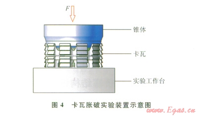 將新型復(fù)合橋塞錐體錐入卡瓦,放在拉壓實驗機實驗工作臺上(如圖4所示),拉壓機向錐體緩慢垂直加載直到卡瓦破裂,測試卡瓦破裂所需載荷[8]。經(jīng)反復(fù)10次測試實驗,卡瓦沿應(yīng)力槽破裂,破裂加壓載荷為2530kN