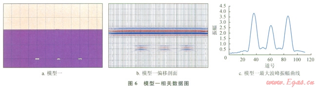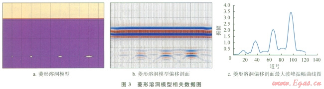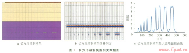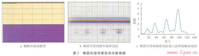 2-b是橢圓形溶洞偏移剖面,圖2-c為橢圓形溶洞最大波峰振幅曲線圖;圖3-b、圖3-c分別是菱形溶洞偏移剖面及最大波峰振幅曲線圖??梢钥吹?,無論是橢圓形模型還是菱形模型,隨著溶洞橫向尺度的增加最大波峰振幅是增加的,這和長方形溶洞正演模擬結(jié)果很相似。