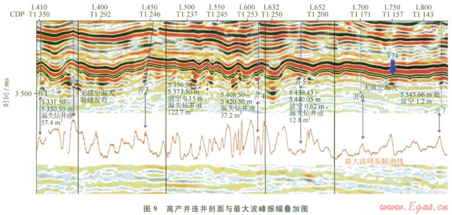 9為某區(qū)塊連井剖面與其儲層段最大波峰振幅曲線疊合圖。由圖9可見,這些井除井2、井6外,都設(shè)計在“串珠”或“羊排”這些具有溶洞反射特征的位置上,同時它們都對應(yīng)著最大波峰振幅曲線的極大值點(diǎn),且井l、井3、井4、井5和井7都有鉆具放空、鉆井液漏失等表征溶洞發(fā)育的證據(jù),而井2位于兩串珠之間,井6未在串珠上,這兩口井均無放空漏失現(xiàn)象,即是無溶洞發(fā)育,可見振幅曲線出現(xiàn)極值是溶洞反射特征之一,但并不是所有極值都意味著溶洞發(fā)育。隨著這些井對應(yīng)振幅的減小,其產(chǎn)量總的來說是減小的,而產(chǎn)量作為一種衡量溶洞大小及發(fā)育程度的指標(biāo),可見反射振幅越大的溶洞,其尺寸越大,發(fā)育程度越高,這與前面的結(jié)論是相符合的。所以通過這種手段識別溶洞,可指導(dǎo)實際生產(chǎn),提高鉆探成功率。