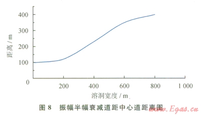 8為不同寬度溶洞反射的振幅衰減至最大振幅一半時對應(yīng)地震道距溶洞中心道的距離圖,這一屬性可以反映溶洞在剖面上的響應(yīng)寬度隨溶洞寬度的變化情況。從圖中可以看到,隨著溶洞寬度的增加,半幅衰減道與中心道距離是不斷增加的,增大幅度是先變大再變小,在菲涅爾帶半徑附近增大幅度達(dá)到最大。