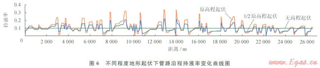 模擬計(jì)算得到不同程度地形起伏下凝析氣管道內(nèi)持液率的沿線分布曲線如圖6所示。從圖6可以看出,在無地形起伏的條件下,管路沿程持液率基本保持不變,平均持液率為0.1;而存在地形起伏的情況下(對照圖6和圖3),管內(nèi)持液率隨沿線地形起伏的變化出現(xiàn)了不同幅度的波動,且地形起伏高度越大,持液率波動的幅度也越大,在上坡管段內(nèi)持液率相對較大,下坡管段內(nèi)持液率相對偏小。分析這種地形高差對持液率影響較大的原因是:上升管段內(nèi)流體在爬坡過程中壓降損失比較嚴(yán)重,管內(nèi)壓力下降相對較快,氣相體積膨脹,使得氣相流速加快,攜液能力增強(qiáng),致使持液率隨地形高差的增加而增大;反之亦然。