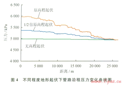 管路壓降是管道設(shè)計(jì)、建造和運(yùn)行的基礎(chǔ),而管路溫降是管道安全運(yùn)行的必要條件。對于凝析氣田混輸管網(wǎng)而言,管道沿線壓降和溫降與管內(nèi)重?zé)N凝析液量和持液率的大小又是密切相關(guān)的,于是模擬了管路壓降和溫降受不同程度地形起伏影響的情況(45)。