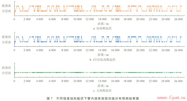 3)地形起伏導(dǎo)致管內(nèi)流體流型極不穩(wěn)定,上傾管路內(nèi)流體流型為段塞流,下傾和水平管路內(nèi)流體流型為分層流;而地形起伏在原高程和12原高程兩種狀態(tài)下沿線管內(nèi)流體流型模擬結(jié)果大致相同。