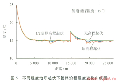 由圖5可知,在起始段,由于管道內(nèi)外溫差較大,管內(nèi)流體溫度下降較快,直至接近管道埋深溫度后,溫降才趨于緩和,并圍繞埋深溫度上下微幅波動。管路沿程存在地形起伏時的管內(nèi)流體溫度波動幅度相對大一些,12倍原高程起伏下的管內(nèi)流體溫度次之,而無高程起伏下的管內(nèi)溫度幾乎未出現(xiàn)波動現(xiàn)象(5中在距起點(diǎn)l5km處出現(xiàn)的氣流溫度陡然變化是由于另一口凝析氣井接入該管網(wǎng)系統(tǒng)所致),但從整體上看,不同程度地形起伏下管路沿程溫度變化趨勢大致上是一致的??梢姡匦纹鸱鼘δ鰵夤軆?nèi)流體溫度的影響并不大。