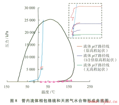 凝析氣混輸管內(nèi)流體的相包絡(luò)圖和天然氣水合物形成曲線預(yù)測結(jié)果如圖8所示。圖8中右上角虛線框圖是對不同程度地形起伏下管內(nèi)流體PT路徑線的局部放大圖。圖8中的天然氣水合物形成曲線左側(cè)與相包絡(luò)線圍成的區(qū)域?yàn)樘烊粴馑衔镄纬蓞^(qū)(天然氣具備生成天然氣水合物的壓力和溫度)。模擬結(jié)果顯示,在管路沿線存在地形起伏的情況下,管內(nèi)流體PT路徑線有一部分位于天然氣水合物形成區(qū)內(nèi),再加上所模擬的凝析氣井井流物中含有游離水,所以這部分管段內(nèi)會有天然氣水合物生成,且原高程起伏下管內(nèi)有突然水合物形成的區(qū)域(或管段)l2倍原高程起伏下的管內(nèi)天然氣水合物區(qū)域更大一些;而沿程無地形起伏時管內(nèi)凝析氣PT路徑線全部位于天然氣水合物區(qū)外側(cè),說明水平管內(nèi)無天然氣水合物生成。