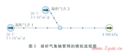 在凝析氣的PVT分析報告中,通常提供的是凝析氣井井流物中天然氣和凝析油的組成分析數(shù)據(jù),并未將水組分納入其中,因此,計(jì)算前需將天然氣、凝析油和水按照現(xiàn)場實(shí)際產(chǎn)量進(jìn)行混合,得到完整的井流物組分?jǐn)?shù)據(jù),并以此作為組分模型的輸入,然后開展模擬計(jì)算分析。利用PIPHASE搭建的組分合成模擬和管網(wǎng)系統(tǒng)模擬的流程如圖1、2所示,利用該流程即可開展模擬計(jì)算。