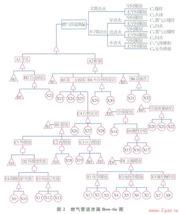 城市燃?xì)夤艿赖娘L(fēng)險取決于管道失效的可能性和事故后果的嚴(yán)重性[3],為將燃?xì)夤艿朗鹿实那耙蚝蠊Y(jié)合起來進(jìn)行風(fēng)險評價,首次引入Bow-tie模型,將風(fēng)險分析中的故障樹和事件樹聯(lián)系起來。Bow-tie模型最早出現(xiàn)在澳大利亞昆士蘭大學(xué)關(guān)于帝國化學(xué),工業(yè)公司危害分析的課程講義[4],隨后殼牌公司將其應(yīng)用于阿爾法鉆井平臺爆炸災(zāi)難分析中[5],至今這一技術(shù)已被廣泛應(yīng)用到一些重大事故。