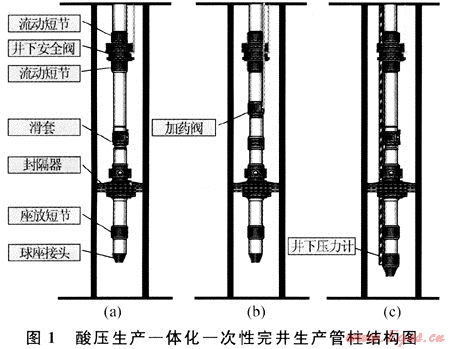設(shè)計后的管柱結(jié)構(gòu)示意圖見圖1,油管用合金鋼防腐管,井下工具能滿足抗硫化氫腐蝕需要,耐溫150℃,耐壓70MPa,油管絲扣為金屬氣密封VAM TOP。圖1-a是不帶加藥閥和井下壓力計的生產(chǎn)管柱,一般在斜井和產(chǎn)量較高的井中使用;圖1-b是采用毛細管組成的能加注溶硫劑的生產(chǎn)管柱,在產(chǎn)量較低易產(chǎn)生硫沉積的氣井中使用;圖1-c是可實時監(jiān)測井底溫度和壓力的生產(chǎn)管柱,在井下又安裝了壓力、溫度傳感器,一般只在直井中采用。