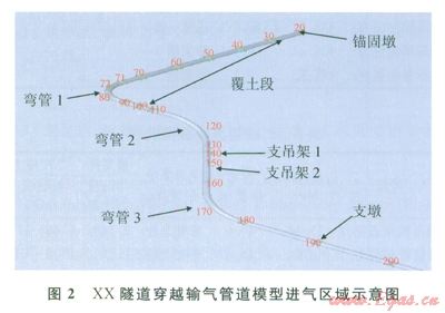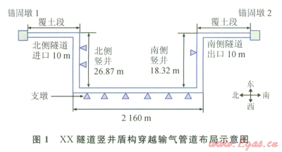 根據(jù)XX隧道穿越管道設(shè)計(jì)資料,隧道穿越的總長(zhǎng)度為2246.7m,隧道內(nèi)全部采用露空與管架支撐形式,在隧道進(jìn)口和出口處分別設(shè)置錨固墩l和錨固墩3,用以截?cái)嗨淼劳夤艿缹?duì)隧道內(nèi)管道的影響。隧道進(jìn)口豎井深度為26.87m,支吊架2個(gè)(1個(gè)支吊架距隧道進(jìn)口處5.4m)2個(gè)支吊架間距為2.816m;平巷長(zhǎng)度為2160m,平巷內(nèi)設(shè)置支墩,支墩間距為l2m,共設(shè)置支墩l81個(gè);隧道出口豎井深度為18.32m,支吊架l個(gè)(距隧道出口處6.624m);管道彎管處的曲率半徑為6D(D為管道外徑)。管道的材料為L485,管徑為914mm,壁厚為22.2mm,彎管壁厚為23.8mm。根據(jù)式(1)計(jì)算得到試驗(yàn)壓力(pt)21.2MPa。XX隧道豎井盾構(gòu)穿越輸氣管道具體布局如圖1所示。
