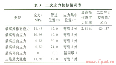 1)在試壓工況下的一次應(yīng)力和綜合應(yīng)力校核中,最大應(yīng)力產(chǎn)生的位置都在管道的彎管3處,產(chǎn)生最大二次應(yīng)力的位置在管道的彎管2處,說(shuō)明彎管是應(yīng)力危險(xiǎn)截面處。