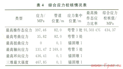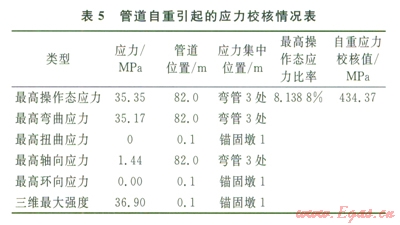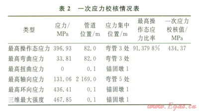由表25可知,最高操作態(tài)綜合應(yīng)力產(chǎn)生在管道彎管3處,管道系統(tǒng)單元l70180即管道7682m處的最高操作態(tài)應(yīng)力為397.46MPa,最高操作態(tài)應(yīng)力比率為91.5034%,綜合應(yīng)力主要產(chǎn)生在彎管3處,一次、二次應(yīng)力及綜合應(yīng)力校核最高節(jié)點(diǎn)應(yīng)力均未超過(guò)434.37MPa,滿(mǎn)足管道的強(qiáng)度和柔性要求。
