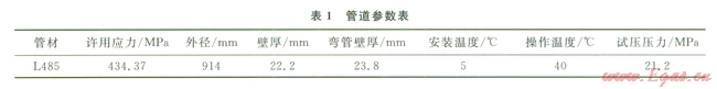 XX隧道穿越管道為例,根據(jù)SYT0015.1-1998《原油和天然氣輸送管道穿跨越工程設(shè)計(jì)規(guī)范穿越工程》622計(jì)算得到管道的試壓壓力為21.2MPa,試壓介質(zhì)為清水,試壓溫度為20℃,輸氣管道的工作溫度為40℃,建立試壓工況下的應(yīng)力分析模型。表l為該管道的參數(shù)表。