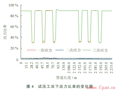 通過(guò)對(duì)XX隧道穿越管道應(yīng)力進(jìn)行分析,得到一次應(yīng)力、二次應(yīng)力和綜合應(yīng)力最高應(yīng)力校核及管道的應(yīng)力分布情況。實(shí)例分析發(fā)現(xiàn)管道應(yīng)力的最大值在管道彎管3處,依據(jù)一次應(yīng)力、二次應(yīng)力和白重引起的應(yīng)力對(duì)比,得出在試壓壓力較高的情況下,內(nèi)壓是產(chǎn)生管道應(yīng)力的主要因素,而且溫度、管道及管道內(nèi)介質(zhì)的自重對(duì)管道應(yīng)力的影響很小。