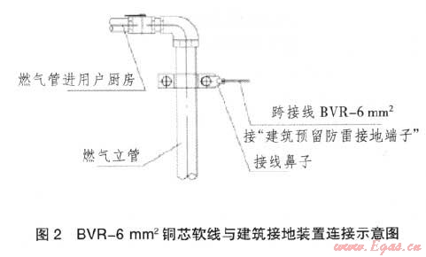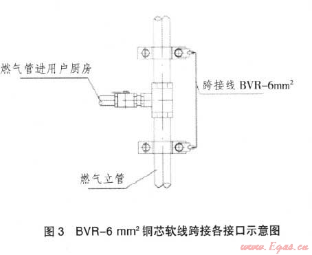 a)對于采用無縫鋼管的立管,當(dāng)立管高度不大于30m時,燃?xì)饬⒐艿捻敹艘擞?/span>BVR-6mm2銅芯軟線與建筑接地裝置相連,具體做法見圖2。底端與燃?xì)庖牍荛y門連接處用BVR-6mm2銅芯軟線跨接,跨接電阻不大于0.03Ω。對于燃?xì)饬⒐芨叨葹?/span>30m以上的建筑,需從30m開始,每隔不大于6m(一般為兩層)與建筑預(yù)留的防雷接地端子相連一處,做法與立管頂端的防雷接地做法相同;b)對于采用鍍鋅鋼管絲扣連接的立管,因各連接口采用聚四氟乙烯生料帶做密封材料,造成立管連接口不導(dǎo)通,各接口處須用BVR-6mm2銅芯軟線跨接,具體做法見圖3?,F(xiàn)有一種新型密封膠,導(dǎo)電性能良好,可作為立管絲扣連接的密封材料,現(xiàn)正在研發(fā),若能推廣應(yīng)用,各接口處就無需再做跨接了。