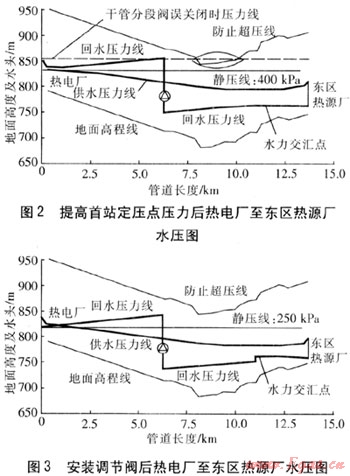 由圖1可見(jiàn),中繼泵站和熱電廠之間回水壓力有一段高于供水壓力。這是因?yàn)橹欣^泵裝在回水管道上并且揚(yáng)程較高。中繼泵站位于輸送干線上,中繼泵站和熱電廠之間沒(méi)有熱用戶,因此不影響系統(tǒng)正常運(yùn)行。