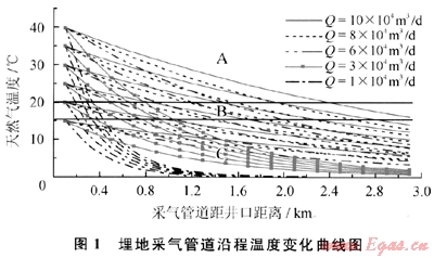 天然氣水合物防治效果主要受管輸壓力、溫度、流量和距離等因素影響。為此,根據埋地管道散熱損失情況,模擬計算管道沿程溫度變化情況,各參數(shù)范圍確定為:氣井產量為(1~10)×104m3/d;井口溫度為15~40℃;運行壓力為7.0MPa;管道規(guī)格為Φ76mm×4mm;采氣管道長度為0~3.0km;管道保溫材料為40mm硅酸巖棉殼;管道埋深為1.8m。