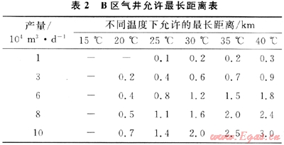 1) A區(qū)氣井的天然氣不伴熱直接進站,不加熱直接脫水,可以取消采氣管道伴熱和站內加熱工藝。不同產氣量和井口溫度允許采氣管道距離不同,其允許最長距離見表1。