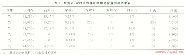 目前,沁水盆地東南部的潞安礦區(qū)是傘國煤層氣開發(fā)的熱點區(qū)域之一。部分井正在進行注CO2現(xiàn)場試驗,為了解煤中主要黏土礦物含量,通過采集潞安礦區(qū)余吾礦和常村礦煤樣,應(yīng)用x射線衍射進行了黏土礦物相對含量測試,結(jié)果見表1。
