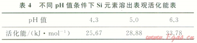 由表4可以看出,Si元素溶出表觀活化能均小于42kJ/mol,表明反應(yīng)為擴散控制反應(yīng)[18]。pH值越低,表觀活化能越小,說明pH值越低,Si越容易溶出。由于碳酸酸性較弱,所以,不同pH值下的表觀活化能差別不大。