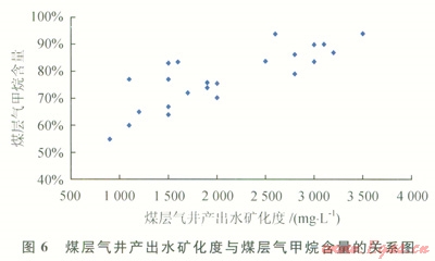該區(qū)含氣量與礦化度呈正相關關系(圖2),東南部地層水礦化度小于1200mg/L的區(qū)域煤層含氣量一般小于2m3/t,而北部地層水礦化度大于1700mg/L的區(qū)域煤層含氣量一般大于4m3/t。同時,煤層氣井產(chǎn)出水礦化度與煤層甲烷含量之間相關性較好(圖6),煤層甲烷含量隨礦化度增加而增加,東南部煤層氣井產(chǎn)出水礦化度低于1200mg/L的地區(qū),煤層甲烷含量一般低于70%,而北部煤層氣井產(chǎn)出水礦化度高于1700mg/L,煤層甲烷含量一般大于80%。說明東南部距離補給區(qū)較近,地下水活躍,不利于煤層氣的保存,而北部遠離水源補給區(qū),水動力處于弱徑流區(qū)一滯留區(qū),保存條件好。另外,總體上北部煤層氣井產(chǎn)氣效果也明顯好于東南部,也說明北部煤層氣富集條件優(yōu)于東南部。
