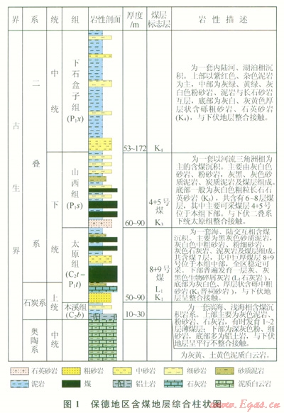 保德地區(qū)行政區(qū)劃位于山西省西北部,構造上位于鄂爾多斯盆地東緣晉西撓曲帶北段,總體上表現(xiàn)為向西傾的單斜構造,地層傾角介于5°~l0°,斷裂構造不甚發(fā)育[1],含煤地層為上石炭統(tǒng)一下二疊統(tǒng)太原組和下二疊統(tǒng)山西組(圖1)。區(qū)內(nèi)發(fā)育煤層15~16層,山西組4+5號煤層和太原組8+9號煤層為主要煤層。其中,4+5號煤層單層厚度介于5~14.6m,平均為7.6m;8+9號煤層單層厚度介于5~14.2m,平均為l0.2m。