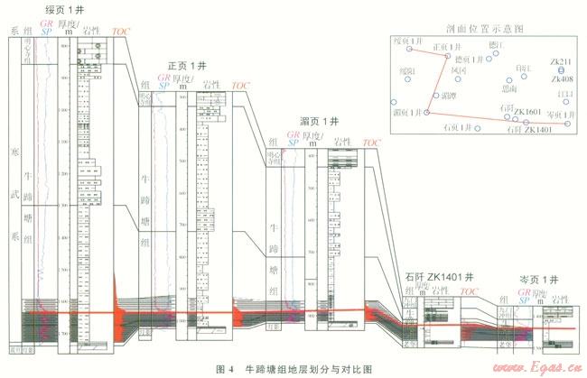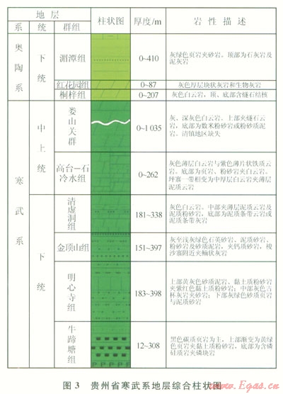 1)貴州省下寒武統(tǒng)牛蹄塘組主要分布于黔北、黔中及黔東  黔東南地區(qū),頁巖層段位于牛蹄塘組下部,巖性主要為含粉砂一粉砂質、碳質泥巖頁巖。