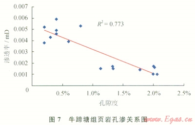 該區(qū)牛蹄塘組頁巖孔隙度為1.3%~25.6%,平均為8.24%,孔隙度中等;滲透率介于0.0010.017mD,平均為0.008mD,滲透率極低。牛蹄塘組頁巖孔隙度與滲透率之間呈線性負相關關系,如圖7所示。