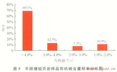 牛蹄塘組干酪根有機顯微組分以腐泥無定型和腐殖無定型為主,前者相對豐度為11%~92%,平均為49%;后者相對豐度為8%~85%,平均為48%。干酪根類型指數為5196,干酪根類型以腐泥型和偏腐泥混合型為主。綜合分析認為:貴州省牛蹄塘組含氣頁巖的母源主要為藻類等低等水生生物,生烴能力較強。通過對牛蹄塘組地表露頭和鉆孔巖心樣品的有機碳含量測試,發(fā)現頁巖有機碳含量范圍為0.7%~14.6%,平均為5.2%,主頻在大于4.0%的區(qū)間(5)。