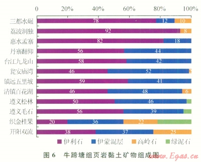 該區(qū)牛蹄塘組頁巖石英、長石等碎屑礦物含量為24%~88%,平均為72.3%;自生脆性礦物含量為062%,平均為8.6%;黏土礦物含量介于l2%~30%,平均為19.0%。黏土礦物以伊利石和伊蒙混層為主,綠泥石較少見(6)。巖石礦物學特征表明:頁巖儲層脆性礦物總體含量高,具有較好的破裂潛力,預測開發(fā)過程中可取得較好的儲層改造效果[12]。
