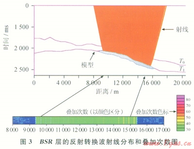 通過目標體的二維地震剖面,按HF-OBS分布間距,通過射線追蹤模擬,分析縱、橫波接收情況,根據(jù)覆蓋次數(shù)與均勻程度,選取最佳的覆蓋效果(3)。圖中藍色表示水合物目標體(剖面),射線所指的紅色區(qū)域表示所對應的反射轉(zhuǎn)換波射線分布區(qū)域。通過對HF-OBS分布間距為100m、200m、300m、400m、500m600m、700m1000m等情況下模擬得到的幾組數(shù)據(jù)的分析比較,分別計算落入不同距離的線段內(nèi)的疊加次數(shù),并用色標進行表示,然后分析疊加次數(shù)的均勻程度和覆蓋效果。當HF-OBS分布間距在500m以下時(300400m效果最佳),線段內(nèi)的疊加次數(shù)達超過30次,并且疊加次數(shù)的分布比較均勻。最后,確定HF-OBS臺站間距小于500m時效果較好,且分布間距愈小,所使用的HF-OBS臺數(shù)愈多,疊加次數(shù)愈高,覆蓋效果愈好。
