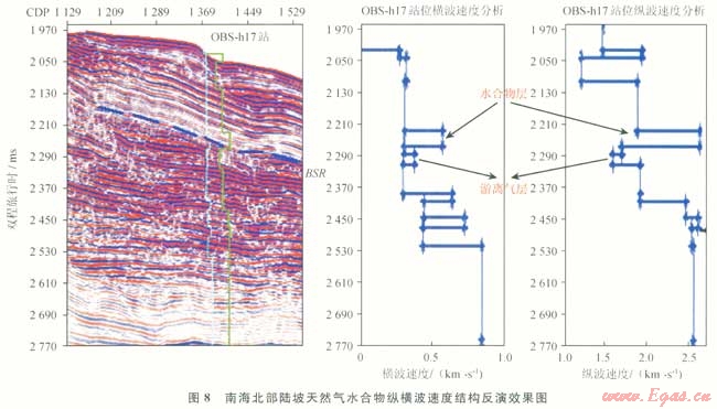 盡管橫波的整體成像效果尚無法與縱波相比,但其走時信息可用于縱橫波速度聯(lián)合反演以獲得HF-OBS所在位置較可靠的縱波和橫波速度,進而進行定量分析并確定水合物存在與否。圖8HF-OBShl7站位的速度反演結(jié)果。縱橫波速度在BSR上部明顯增大,縱波速度值介于17882742ms,增幅為4201090ms;橫波速度介于400600ms,增幅為200260ms,反映水合物礦體的存在。淺部的縱波速度急劇下降而橫波幾乎沒有變化,表明此處存在淺部游離氣或游離氣運移通道。從圖8可以看出,HF-OBS反演速度的垂向分辨率比傳統(tǒng)的速度譜分辨率有了很大的提高,充分揭示了天然氣水合物的縱、橫波速度結(jié)構(gòu),并且速度結(jié)構(gòu)異常與BSR及水合物礦體的分布層位有很好的對應關系[18],從而增強了對水合物礦體的分辨能力。