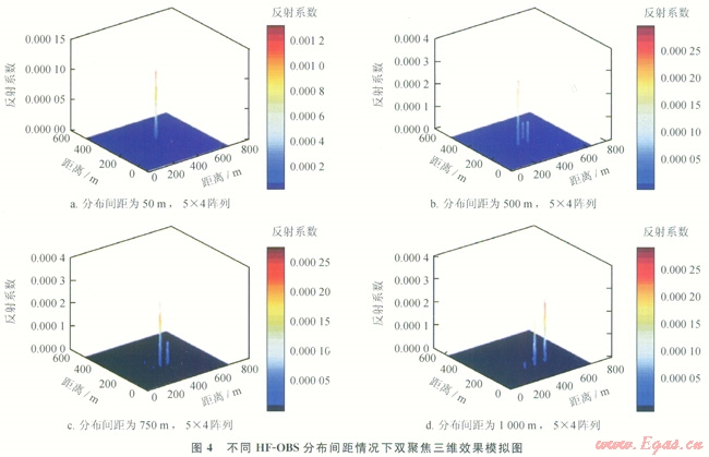 4為聚焦模擬效果圖。當HF-OBS分布間距為500m時,出現(xiàn)明顯旁瓣,但模擬震源的位置并未發(fā)牛變化(4-b);當分布間距為750m時,模擬震源的位置發(fā)生變化,成像效果明顯變差(4-c);當分布間距變小時,模擬成像效果愈來愈好(4-a)。